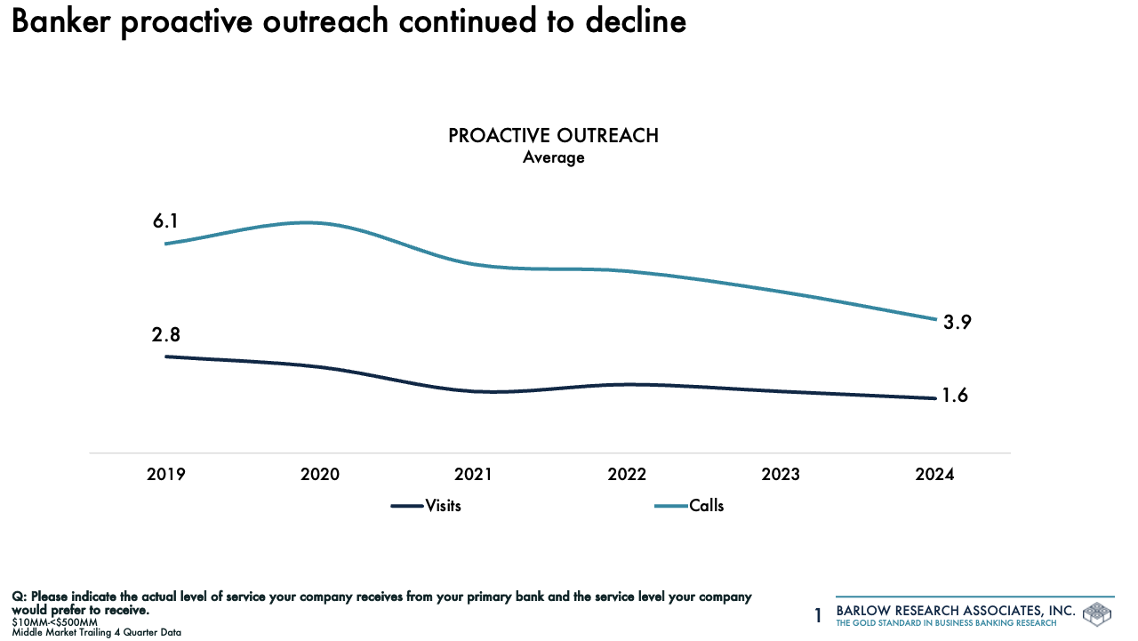 The challenge is engagement. Barlow Research’s latest data shows proactive outreach in the middle market has fallen to historic lows, with relationship managers (RMs) making 2.2 fewer phone calls and 1.2 fewer in-person visits per client annually than five years ago (see chart below). At the same time, responsiveness has slowed, weakening perceptions of value and trust. These declines correlate directly with poorer RM performance ratings – especially around understanding cash flow, company objectives, and proactively recommending solutions.