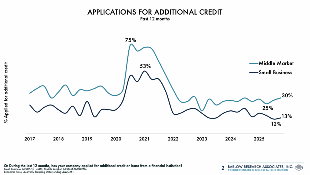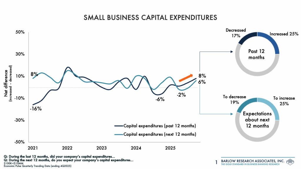 Businesses appear cautiously optimistic going into 2026, according to Barlow Research’s latest 4Q2025 Economic Pulse Study. Although many small businesses (companies with $100K-<$10MM in annual sales volume) continued to struggle, there are signs that others are looking to begin reinvesting in their companies. Middle market companies ($10MM-<$500MM in annual sales) continue to be hampered by elevated costs, but have become more active in seeking additional credit.